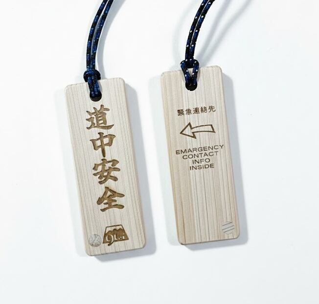 表面には、「道中安全」を、裏面には、緊急連絡先が中に書いてあることをレーザー刻印したものです。